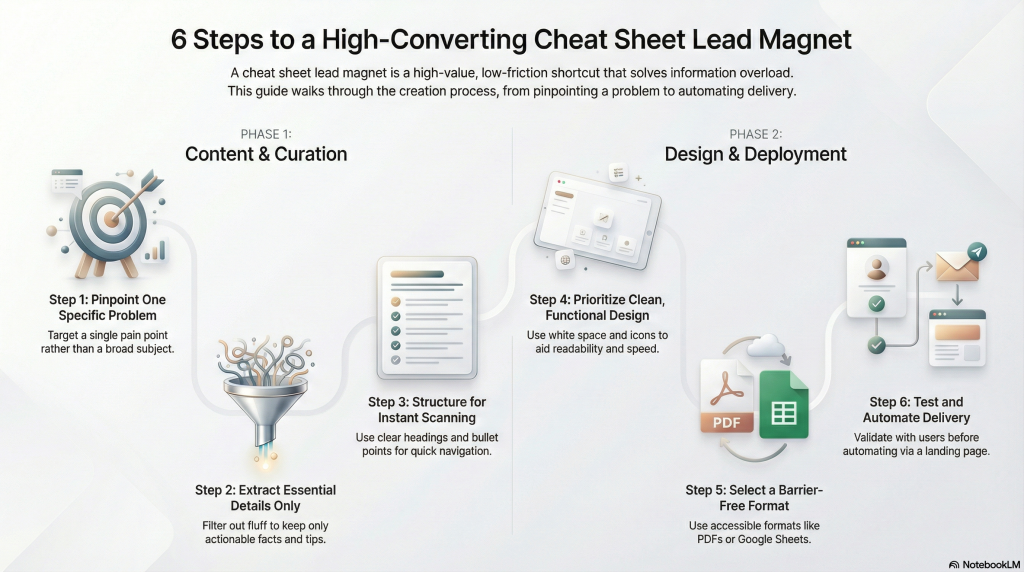 A high-converting cheat sheet starts with focus and ends with flawless delivery. Here’s exactly how to build one that your audience actually wants: