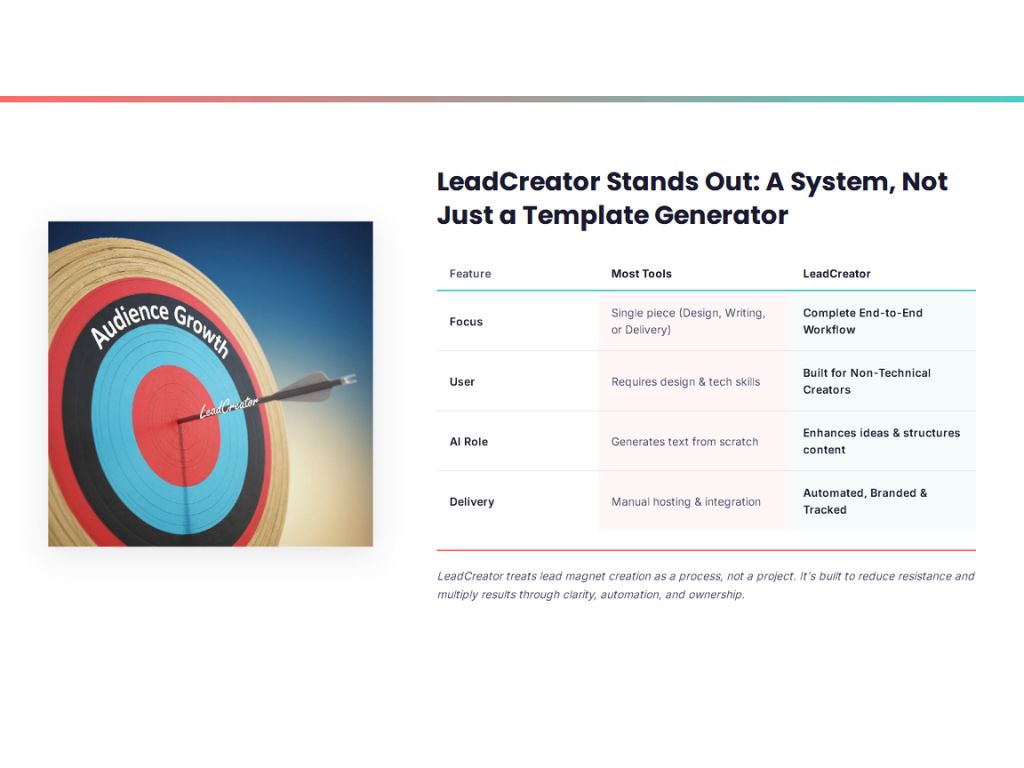 LeadCreator stands out because it treats lead magnet creation as a process, not a project. It’s built to reduce resistance and multiply results through clarity, automation, and ownership.