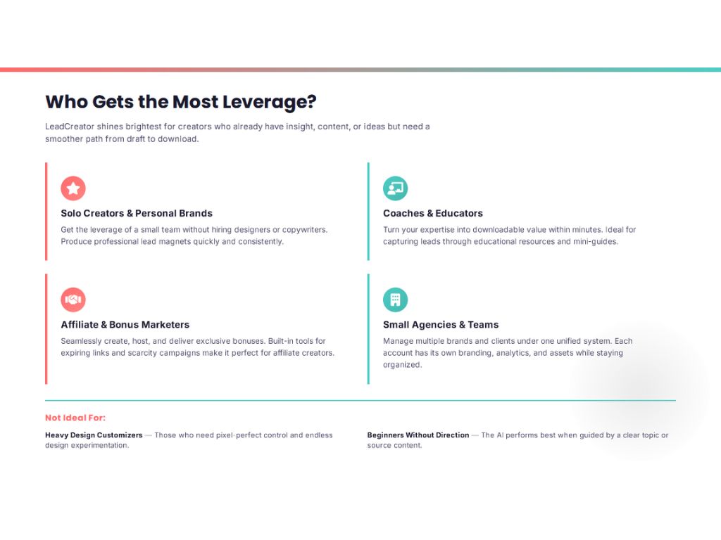 - Ideal for creators who value speed and structure. Perfect for solo entrepreneurs, coaches, and small teams who want professional lead magnets without technical setup or design overload.