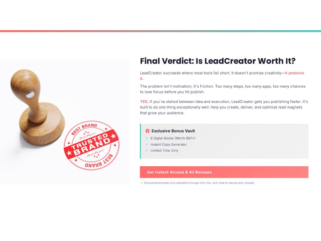 LeadCreator shines brightest for creators who already have insight, content, or ideas but need a smoother path from “draft” to “download.”