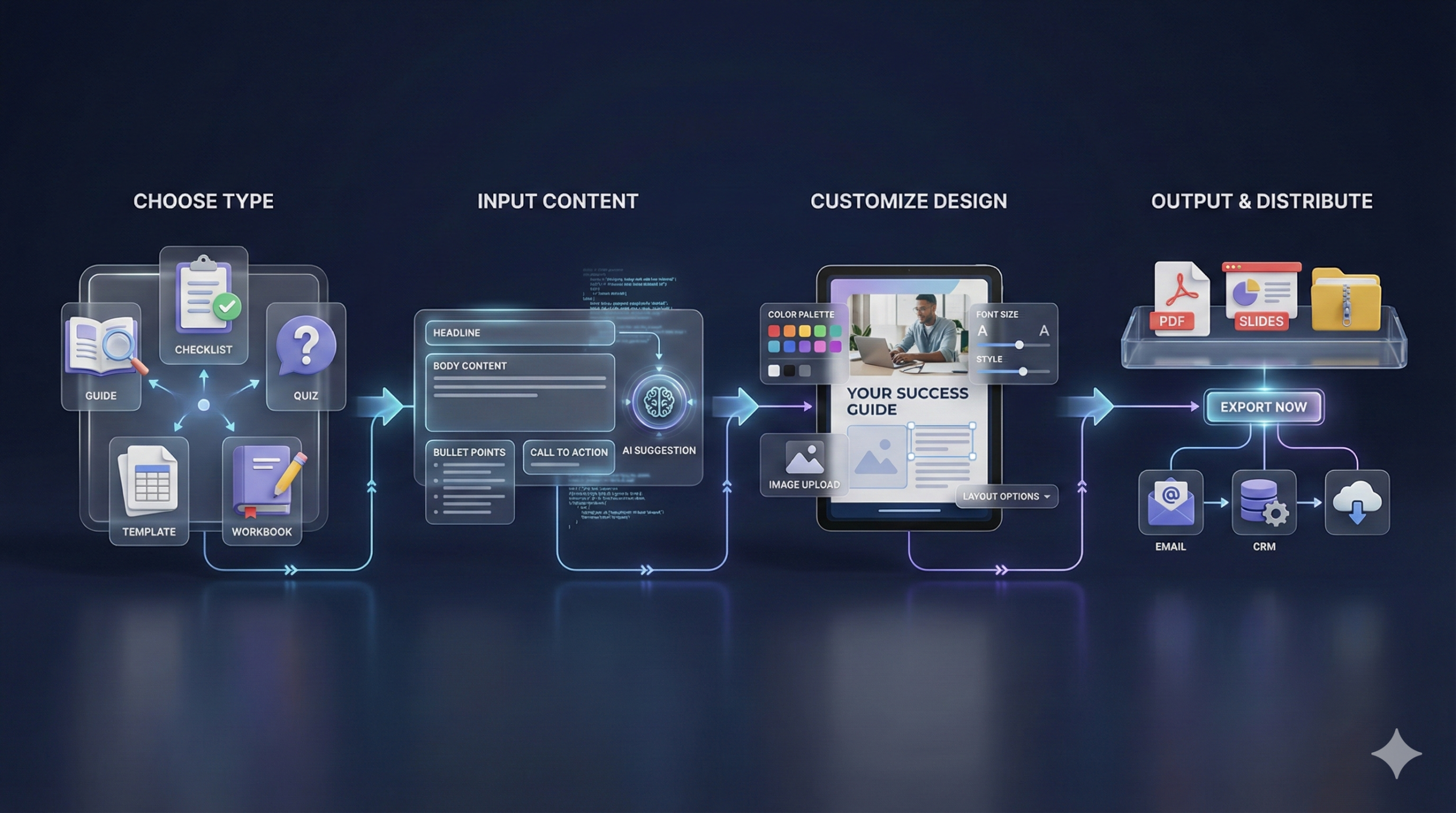 Most generators let you export your finished lead magnet as a PDF, slide deck, or interactive file. Advanced versions integrate with email platforms and CRMs, letting you automate delivery and follow-up sequences with minimal setup.